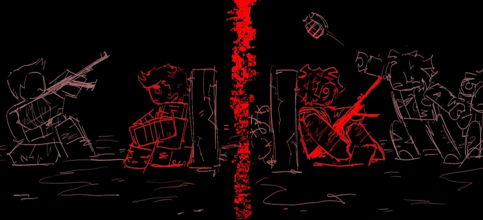 Slasher takes cover behind a barrier as a fellow bacon soldier throws a grenade at enemy lines. This mirrors a scene from the first Last Guest film, where Guest 1337 hides behind cover while Matt fires before being critically injured. They fought in the Memories Underground War map.