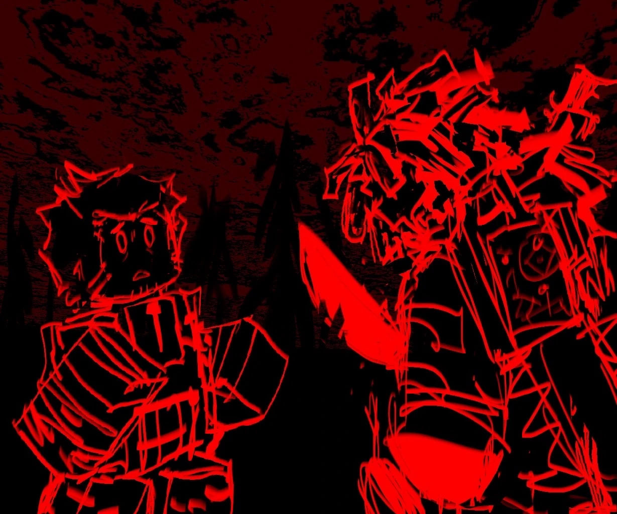The exact circumstances of how Slasher arrived in FORSAKEN remain unknown. Though, he holds a deep vendetta against Guest 1337, as he was the Last Guest who joined the Roblox Army to battle Slasher's own kind, the Bacon Hairs. This explains why the Slasher has a custom kill animation when killing Guest 1337, and an official lore image on the right depicts him going against the Guest in the Forsaken realm, while The Spectre watches from the sky.